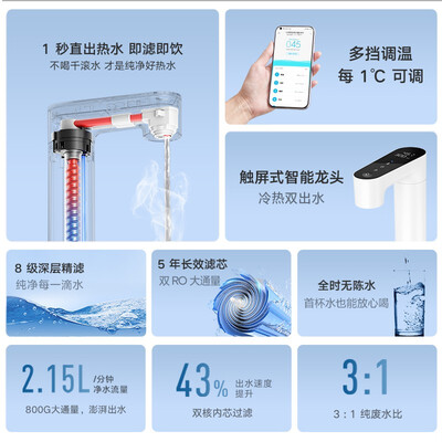 1秒即热的专利技术,可连续出热水,即滤即饮无需久等。有4个常用模式,可通过米家APP调节每个模式的水温、水量,满足家人多种需求。