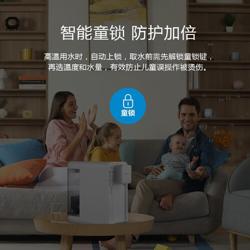 一键启动童锁功能,避免宝贝好奇而误操作烫伤,水温水量分开控制,智能换水换芯提醒,无需费心记忆,自在畅想好水时光。