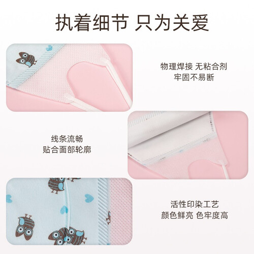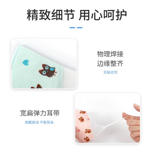 立体造型设计,舒适贴合宝宝脸型。3层过滤装置,能够有效防护细菌滋生。柔软材质打造,更加呵护宝宝娇嫩肌肤。宽扁耳绳,软弹不勒。