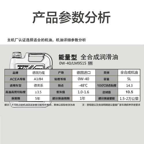 德国原装进口,延长换油周期,流动迅速平顺,车辆启动轻松。高低温稳定性好,能够保持稳定的油膜强度,防止油膜破裂。
