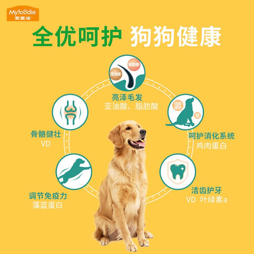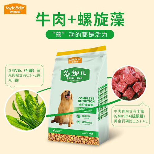 添加了牛肉骨粉,含有动物性钙源,钙磷配比更科学。高蛋白低脂肪的配方,不易造成狗狗肥胖现象。含有叶绿素,有助于皮肤健康。