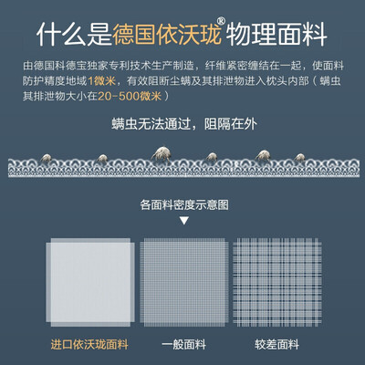 枕面采用依沃珑德国物理防螨面料,告别螨虫困扰,带来洁净舒适好睡眠。低枕曲面设计,贴合肩颈曲线,更适合手机低头族和电脑办公族。