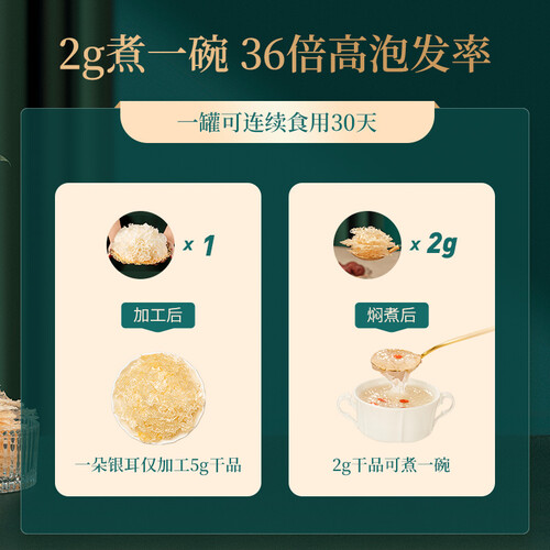 甄选多中草药为基底进行培育种植,使银耳的营养物质更加丰富。采用先进的技术进行加工,银耳的出胶速度快,更易吸收。