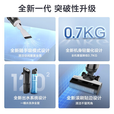 吸拖洗一体,搭配多种刷头,搞定多种应用场景。升级轻量化机身设计,打扫轻松不劳累。智能污水系统,污水箱不用频繁倾倒,省力省心。