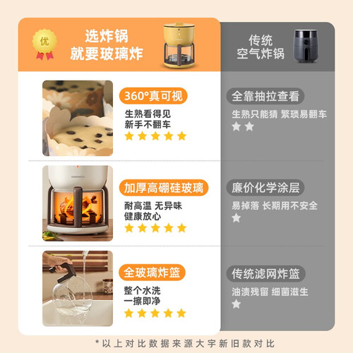 个性高颜值的沙漏造型,美观又大气,结合高硼硅玻璃,耐用又方便查看烹饪过程。内置微动开关,取篮即停,中途添加食物更方便。