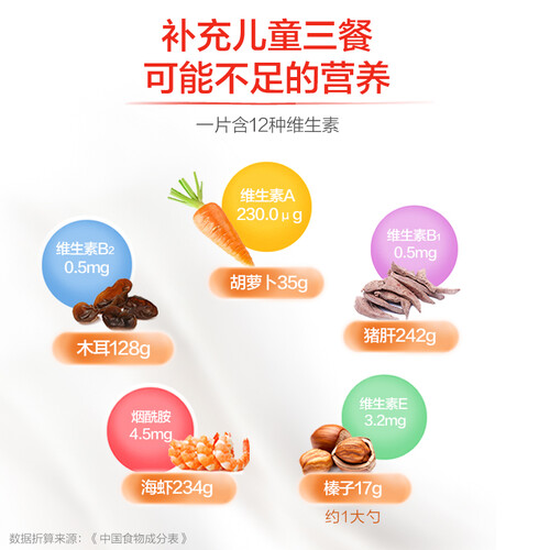 补充儿童三餐可能不足的营养,一片含12种维生素,先进微囊技术,可以隔绝空气,包裹营养成分,锁住每一片精华,保留成分的活性。