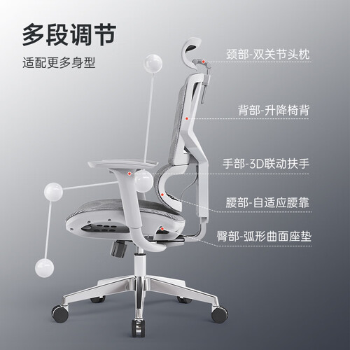 椅背能进行3挡升降调节,可根据个人需求调节高度,给予脊椎舒适的支撑感,设计贴心。可后仰130°的设计,方便午间睡午觉。