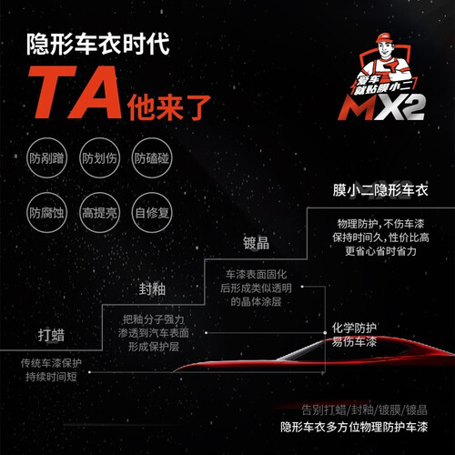 隐形车衣,可以为爱车实现多方位物理防护,从此告别为爱车手动打蜡、封釉、镀膜和镀晶等情况。胶层稳定技术,车漆光亮如新,不留残胶。