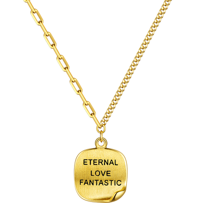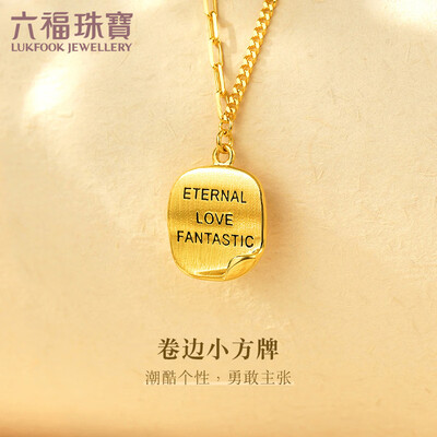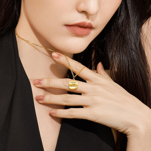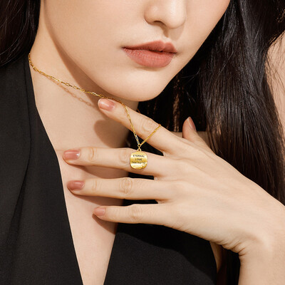 独特几何状的卷边方牌造型,加入英文字母刻字,彰显时尚个性。光影细腻的足金材质,配合推砂工艺处理,凸显出哑光丝面质感。