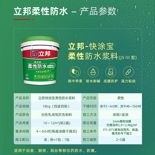 柔性防水涂料,柔韧度好,成膜速度快,加持防护力。而且耐水耐碱,不易失性,是厨卫防水常备用具。