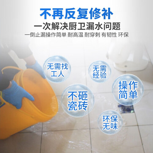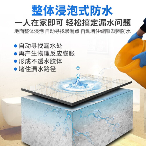 整体浸泡地面后涂料会自动寻找漏水处,再产生物理膨胀反应以堵住漏水路径,不用费时费力查找漏水点。