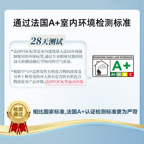 升级水性配方,附着牢稳紧实,抗污防水,不易藏污纳垢,打扫清洁更省心。法国A+环保认证,无刺鼻异味。