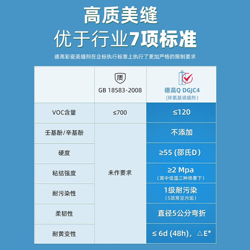 升级配方,使得干透后的胶体坚硬如瓷,耐磨耐刮,不易脱落,更好的保护瓷砖。精工制作,品质保障。
