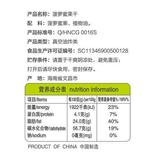 选自阳光充裕的菠萝蜜,经过脱水工艺制作,无任何添加剂。果干嚼起来甜而不腻,在口中留下浓郁的果香。