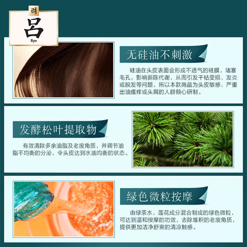 拒绝添加硅油,头皮肌肤自由呼吸,维持新陈代谢。特别添加发酵松叶提取物,去除多余的油脂分泌。