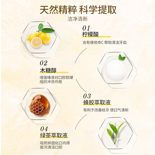 含有绿茶、蜂胶等天然精粹,深层净澈口腔,预防牙龈问题,同时减轻口臭异味,让你清新呼吸,无惧社交尴尬。