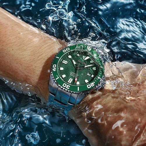 拥有100米级别防水功能,不管是去海边潜水还是游泳馆里游泳,都可以无惧风险。蓝宝石抗压表镜,即使在深水当中也能准确读时。