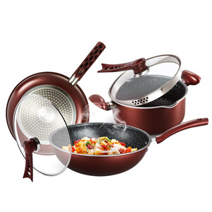 这款套装是优质的麦饭石涂层设计,日常使用的过程中不会有任何的粘锅现象。加上平底锅底设计,加大受热面积。                    上榜理由: