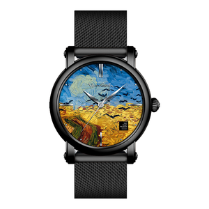 盘面融入梵高的麦田群鸦元素,结合色彩渲染,显得栩栩生动。黑色系表带,耐磨不易脏,方便后期打理。