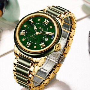 表盘中融入和田玉元素,增添设计感,出席宴会能提升个人魅力。盘面三点钟方向融入日期窗口,抬腕便捷查看日期。