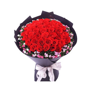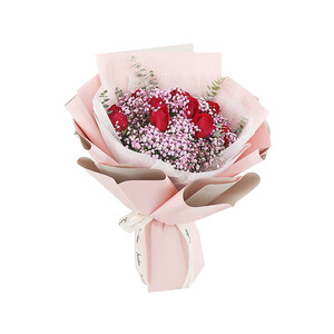 添加有粉色满天星设计,让花束更加美丽,同时带有满满少女心;红玫瑰花色鲜艳,带来自然清新气息,温馨且喜庆。