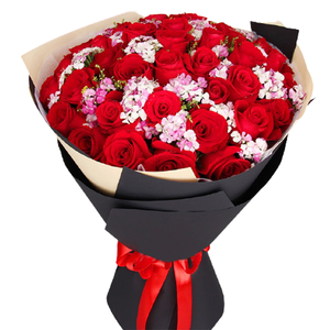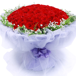 热情浪漫的红玫瑰搭配梦幻浪漫的白纱包材,富有惊喜浪漫,与你的爱人见证幸福美好时刻。