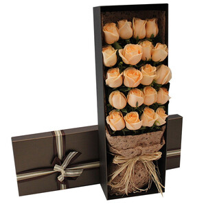 高贵优雅的香槟玫瑰,搭配拉菲草作装饰,田园气息更浓。加厚包装包裹,并添加精美礼盒,有效呵护花束,保持美感不变。 上榜理由: