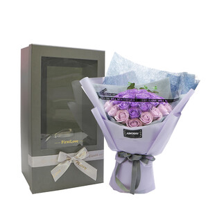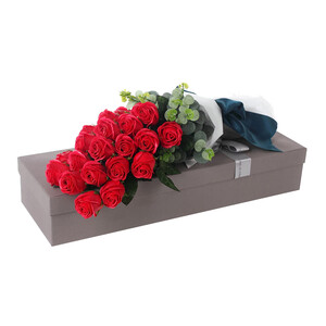 精美的玫瑰花束,个头饱满花瓣细腻逼真,散发淡淡迷人清香。光泽感丝带蝴蝶结装饰,契合女神高雅气质。