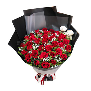 两只小熊公仔点缀花束,萌趣可爱又别致,更显亲密无间。与满天星混搭清新浪漫,花语传达你的真心喜欢。