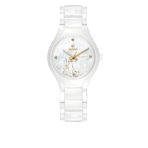 采用清新的白色系表身,彰显出简约的风范。表盘采用神秘的十二宫星象,致敬女性优雅且独立之美。