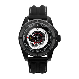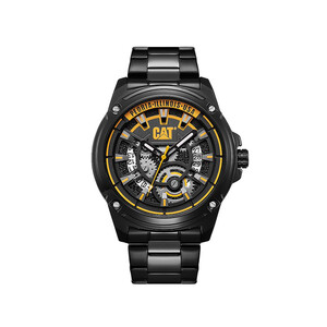 镂空表盘的设计,彰显出满满的机械感。在黑色表盘上加入的亮黄刻度的设计,可轻松读取时间,个性时尚。
