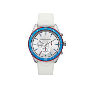 白色表带的设计,搭配蓝色的表圈,赋予了活力青春的气息。表盘也采用了三眼功能设计,更加吸睛。