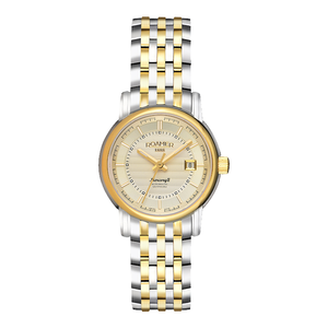 镀金的柳叶指针设计,更显纤细雅致,结合金镶银的精钢表带,光泽亮丽,坚固耐磨,佩戴在腕间,更显优雅格调。