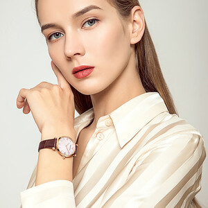 采用玫瑰金的表盘与表框的主题,彰显出几分欧美风的气息。采用牛皮表带,佩戴起来更舒适。