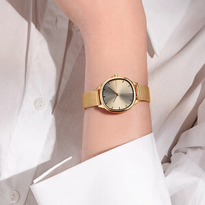 圆形的表盘设计,视觉上显得格外的圆润。金色钢带的设计,闪闪发光,佩戴尽显复古气息。