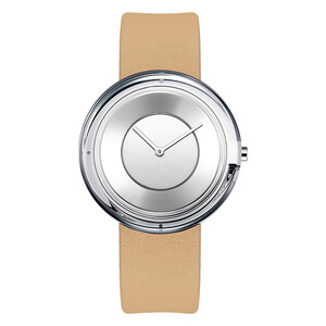银色大圆盘设计,轮廓简约,还透露出一份雅致气息。杏色皮革表带,触感柔软细腻,透气效果佳,为您带来舒适佩戴体验。
