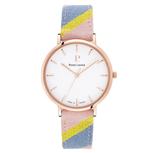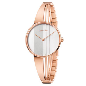 立体撞色条纹装饰表盘,搭配玫瑰金指针,彰显工艺品质。不锈钢镀金表带,精巧珠宝扣开合,便捷美观。