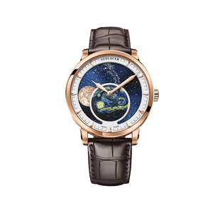 表盘运用梵高油画元素点缀,搭配月相背景,尽显浪漫格调。棕色的牛皮表带,柔韧光滑。