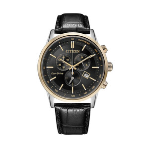 皮革表带,皮质柔软细腻,亲和肌肤,佩戴舒适。金色表圈、时标和指针搭配黑色三眼表镜,优雅稳重,彰显成功男士成熟气质。