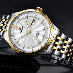 间金钢带设计,展现商务男士的霸气个性,经典不过时。三点位双日历窗口设计,方便更准确的读时,确保商务会议不迟到。 上榜理由: