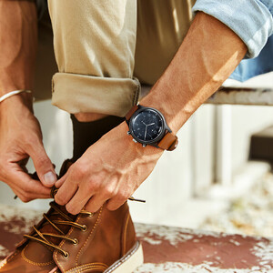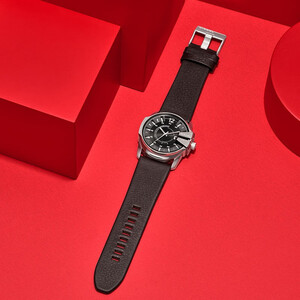腕表镜面采用亚克力塑料材质,与平常材质不同,观感更通透清晰。搭配深卡其色皮质表带,佩戴更显美式型男质感。