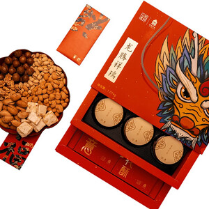 朕的心意的这款坚果礼盒,坚果凝练阳光和岁月的香气,采用精美的龙腾图案礼盒包装,具有吉样的美好寓意。