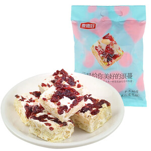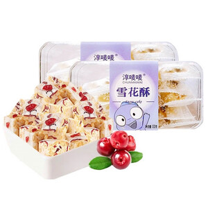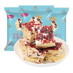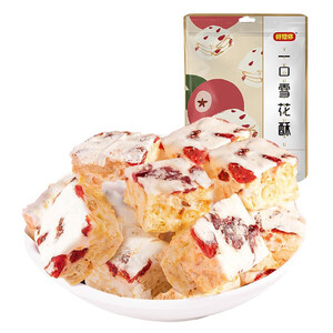 选用全脂乳粉和沙琪玛为原料,经多道工序制作而成,吃起来脆爽不粘牙,蔓越莓的点缀让雪花酥更加美味,醇香不腻,百吃不厌。
