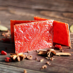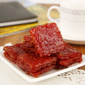 采用新鲜后腿肉为原料,经过多道工艺腌制,再烘干烤制而成,肉脯呈现出棕红色泽,咸中带一点微甜,芳香浓郁值得回味。 上榜理由: