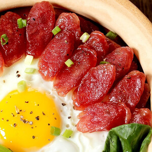 采用肥瘦相间的新鲜猪肉,加入传统的广式调料,制成的香肠色泽红润光亮,香气诱人。