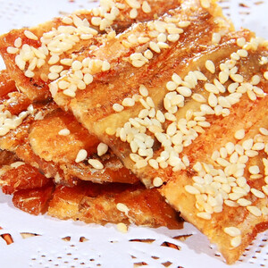 鱼干上一粒粒的芝麻看着就觉得香,还没吃进去,一股麻香似乎在口中洋溢开了。入口感觉好,很有嚼劲,香咸鲜俱全。 推荐商品