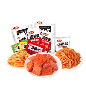 辣条、面筋、魔芋爽的组合包装,嚼劲满满,香辣四溢。适合多种食用场景,追剧、聚会以及夜宵都能满足。