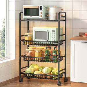 底层镂空网篮,通风沥水,内置物品一目了然,中上层置物板,大空间设计,随手可用。两侧流线形把手,底部旋转滑轮,便于推行。 推荐商品