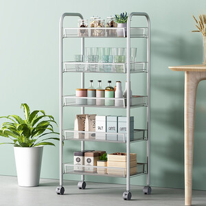 置物架采用落地收纳的设计,结合底部的滚轮,便于移动。底部镂空挡板,有效避免物品掉落更贴心。