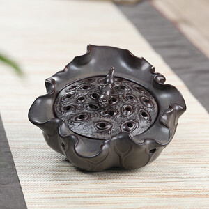 通过陶瓷烧制而成,呈荷花造型,充满古韵味。一炉多用,可在底部放盘香或在莲蓬上插上塔香,烟雾飘渺享受生活。